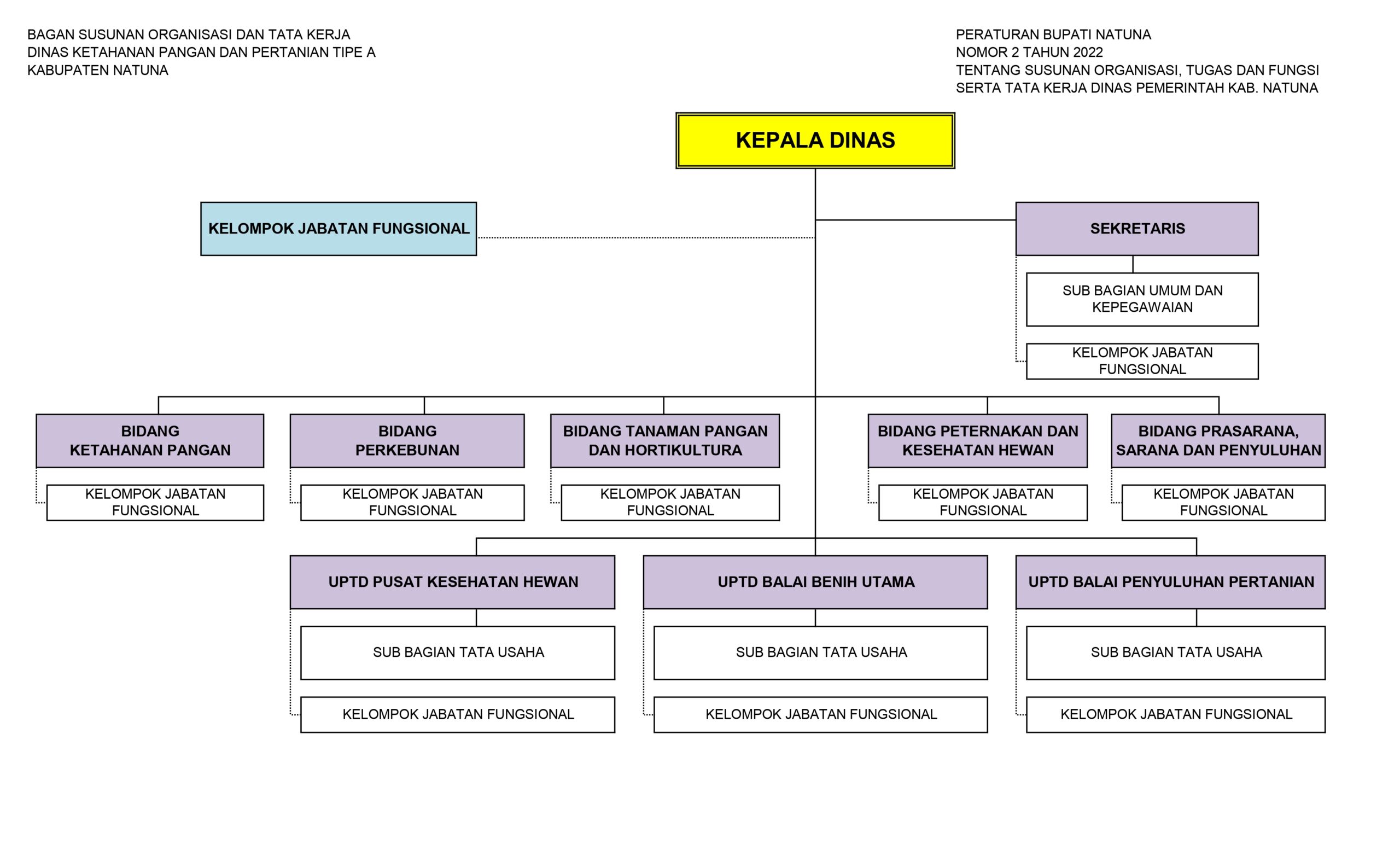 Struktur organisasi Dinas Ketahanan Pangan dan Pertanian Kabupaten Natuna, berdasarkan Peraturan Daerah Nomor 16 Tahun 2021 tentang Pembentukan dan Susunan Perangkat Daerah dan Peraturan Bupati Natuna Nomor 2 Tahun 2022 Tentang Susunan Organisasi, Tugas da Fungsi Serta Tata Kerja Dinas Pemerintah Kabupaten Natuna. Uraian Tugas Dinas Daerah Kabupaten Natuna terdiri dari: