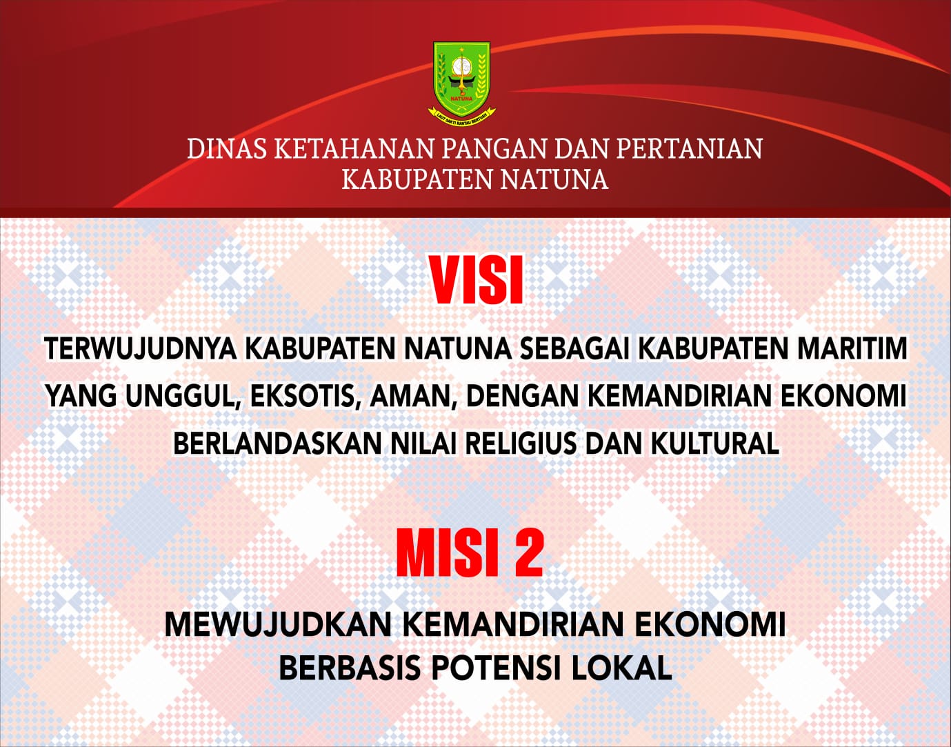 Berdasarkan telaahan dari visi misi RPJMD Kabupaten Natuna 2021 – 2026, Dinas Ketahanan Pangan dan Pertanian mempunyai peranan yang sangat penting dalam mewujudkannya. Keterkaitan tugas pokok dan fungsi Dinas Ketahanan Pangan dan Pertanian terletak pada Misi ke – 2 yaitu “Mewujudkan kemandirian ekonomi berbasis potensi lokal”.